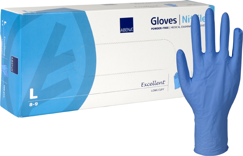 Abena nitrila cimdi L izmērs, pagarināti (30 cm), 100 gab., bez pūdera, zili