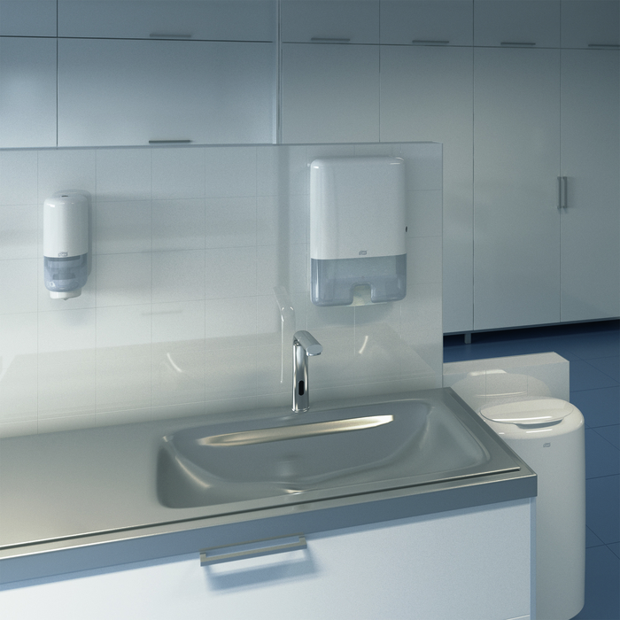 Дозатор с ультратонким дизайном и полистовым отбором позволяет контролировать расход полотенца и подходит для туалетных комнат любой площади.