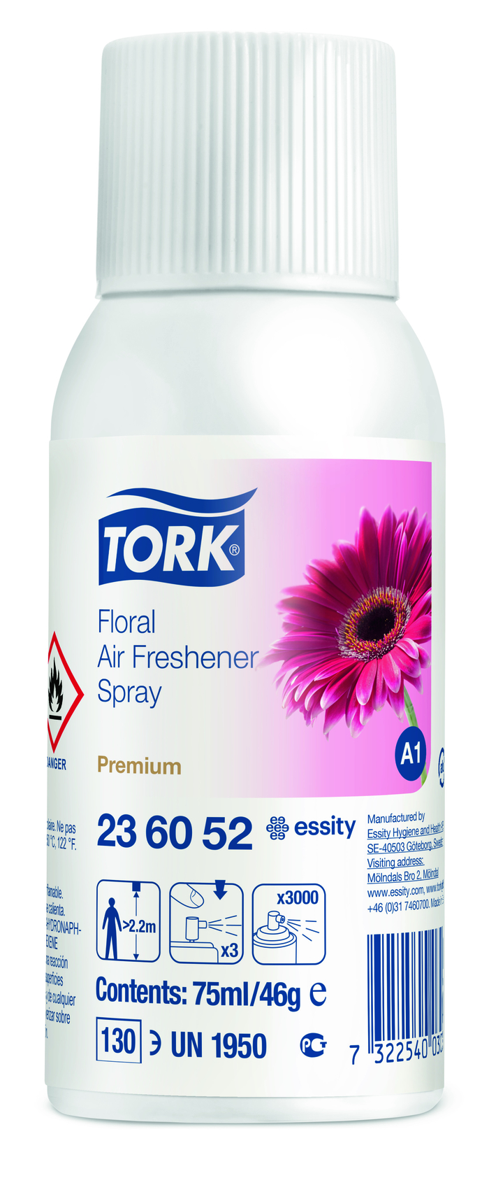 Эффективно и успешно контролируйте запах в туалетной комнате с аэрозольным освежителем воздуха Tork с цветочным ароматом.